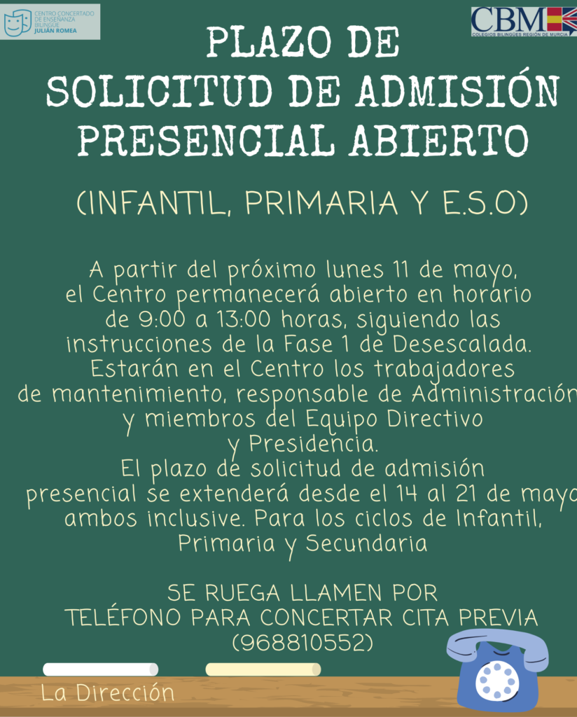 A partir del próximo lunes 11 de mayo, el Centro permanecerá abierto en horario de 9:00 a 13:00 horas, siguiendo las instrucciones de la Fase 1 de Desescalada. Estarán en el Centro los trabajadores de mantenimiento, responsable de Administración y miembros del Equipo Directivo y Presidencia. Para los ciclos de Infantil, Primaria y Secundaria.